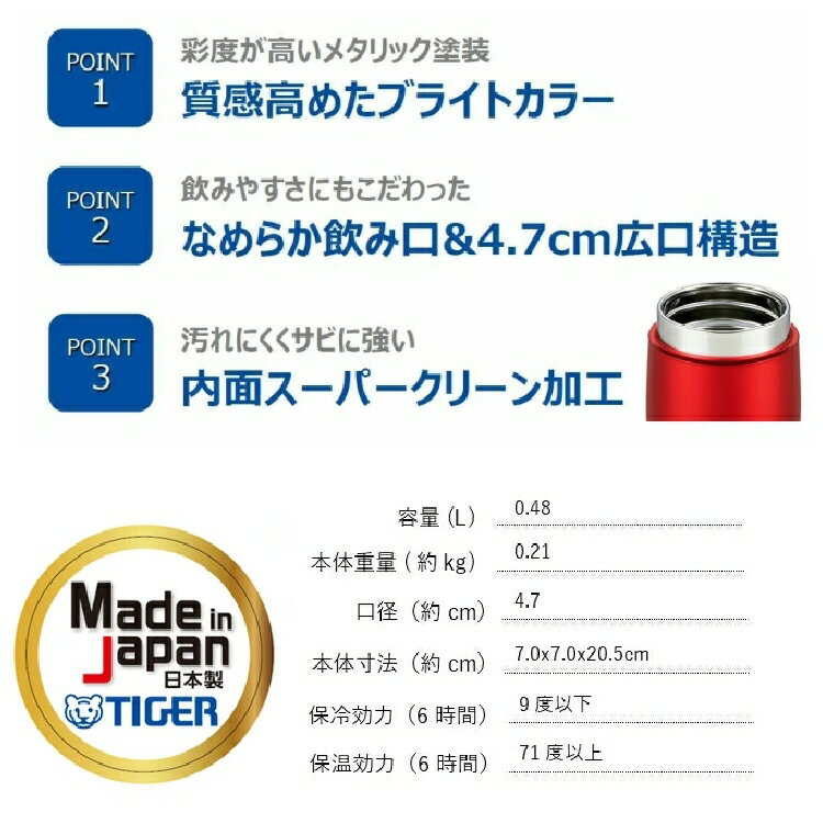 TIGER タイガー 日本製 ステンレスボトル MJA-B048(0.48L) 商品説明 彩度が高いメタリック塗装で、 質感を高めたブライトカラー 飲みやすさにもこだわわった なめらか飲み口と4.7cm広口構造 汚れにくくサビに強い 内面スーパークリーン加工 【商品仕様】 容量:0.48L 本体重量(約):0.21kg 口径:約4.7cm 本体寸法:約7.0x7.0cmx20.5cm 保冷効力(6時間):9度以下 保温効力(6時間):71度以下 カラー/JAN AN(マットネイビー)/4904710424155 RM(マットレッド)/4904710424179 PB(ブライトピンク)/4904710424162 AB(ブライトブルー)/4904710424148 ※掲載商品の仕様、デザイン、生産国、発売時期は 予告なく 変更する場合がありますので、 あらかじめご了承ください。