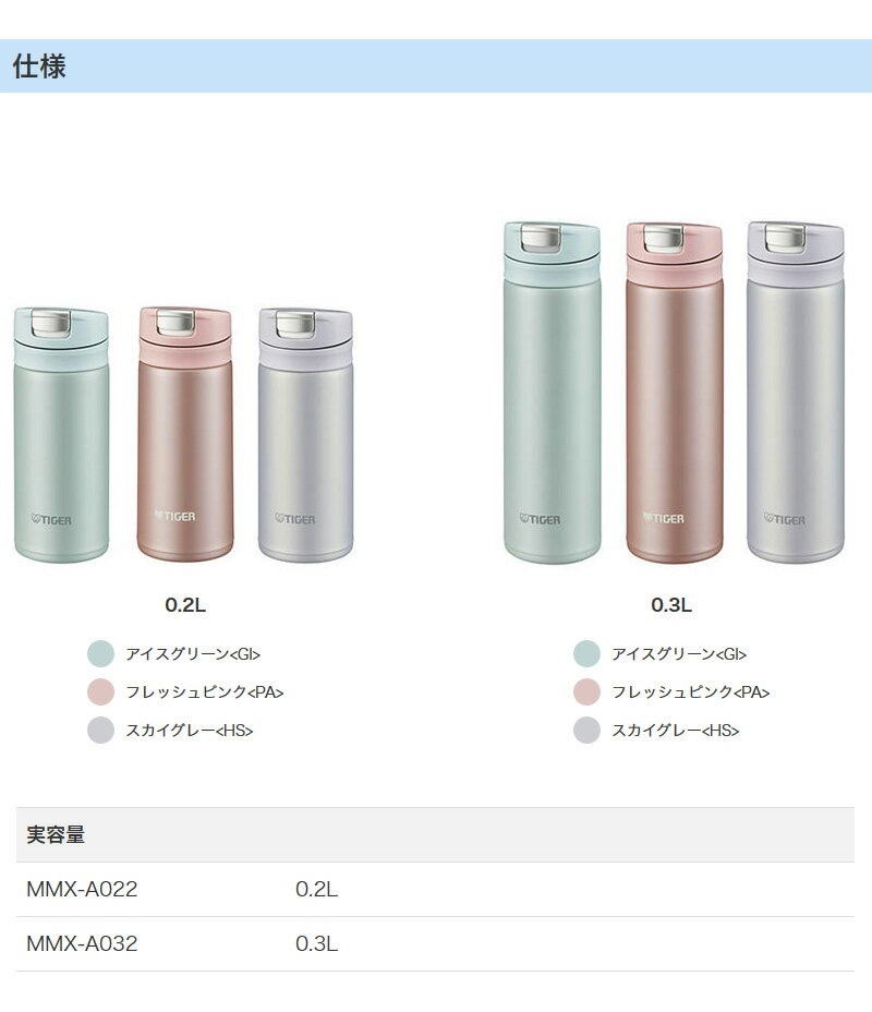 タイガー魔法瓶 ステンレスミニボトル 0.3L MMX-A032PA フレッシュピンク 水筒 ステンレスボトル 保温 保冷JANコード:4904710430149■小さなバッグにすっぽり入るミニサイズ■ふたを閉めるだけでオートロックの安心ワンプッシュボトル。