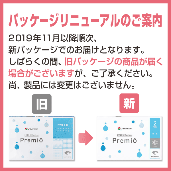 高度管理医療機器 許可番号: 札保医許可(機器)第9164号 「高度管理医療機器等販売許可証」取得 広告文責: 株式会社カズマ コンタクトレンズ通販365レンズ TEL:0800-777-7777 日本国内正規流通品 区分: 高度管理医療機器2WEEK メニコンプレミオ(2週間装用タイプ) 2WEEKメニコン プレミオ取扱い度数 -0.25〜-6.00(0.25ステップ) -6.50〜-13.00(0.50ステップ) +0.25〜+5.00(0.25ステップ) ※BC(ベースカーブ)8.6のみ +0.25〜+5.00をお買い求めのお客様には大変申し訳ございませんが、 項目選択肢「+度数(備考欄にご記載下さい)」を選択の上、 備考欄にご希望の度数をご記入いただきますようお願いします。