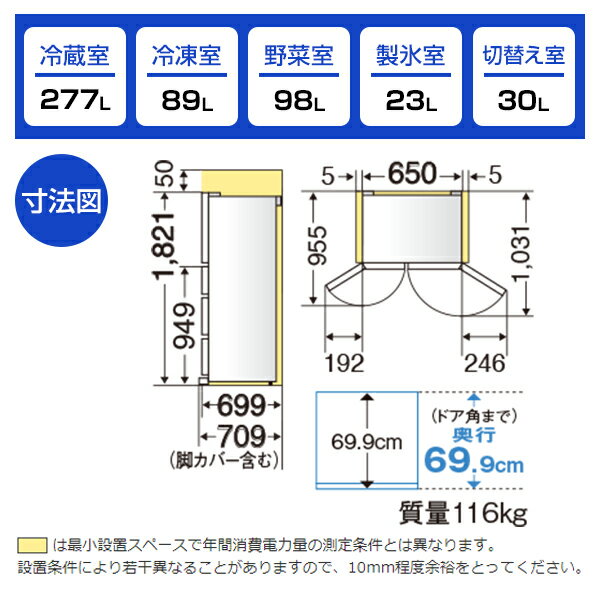 ラクに:抗菌のクリーントレイで清潔&お手入れカンタンムダなく:直接冷気を当てない気流制御と、ケース前方左右に設けたスリットで密閉空間の間接冷却効率 アップおいしく:3色LEDを搭載で、保存している間にビタミンCアップスペック* 外形寸法(幅×高さ×奥行)mm(ハンドル・脚カバーを除く):650×1821×699mm* 据付必要寸法(幅×高さ×奥行)mm:709×1890×758mm* 本体重量(kg):116kg* ドア数:6ドア* ドアタイプ:観音開きタイプ* 総有効内容量:517L* 冷蔵室容量:277L* 冷凍室容量:89L* 製氷室容量:23L* 野菜室容量:98L* 自動製氷機能:有* 年間消費電力量:245kWh/年(JIS C 9801-3:2015)* 年間電気代目安:約6620円* 省エネ基準達成率:115%(目標年度2021年)* 省エネ性能(★